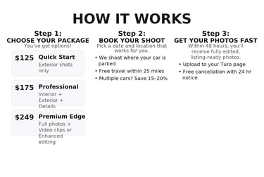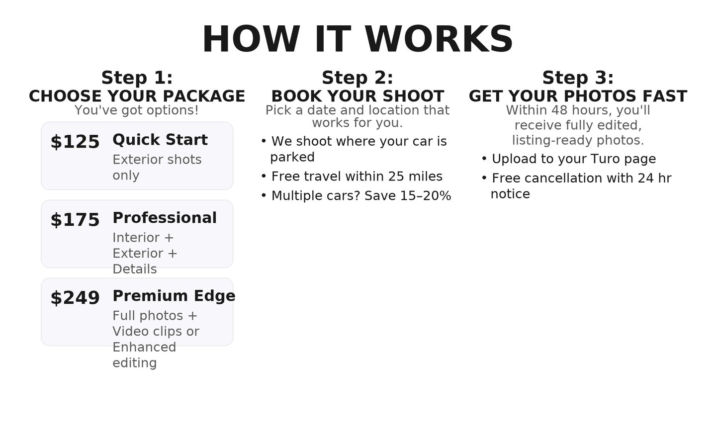 But don’t worry—we photograph all vehicles, not just the flashy ones. Whether you’ve got a Civic or a Cybertruck, we’ll help your Turo listing stand out and book faster.